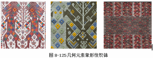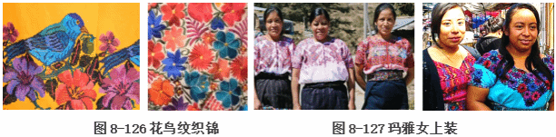 玛雅传统纺织材料是棉和龙舌兰的纤维,染料取自动植物。女人们先将纤维捻线,再用腰机织造布料。玛雅织锦采用妆花技艺、做工精细,以折线、菱形、平行四边形等几何元素构成象形纹样,如树木、神灵、动物等,规整中富于变化,如图8-125,通过同色系渐变的晕色来调和对比色,配色和谐,浓而不艳。