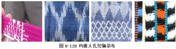 手艺人要把线绑在杆上,打上百个结,然后把线浸泡到深色染料中,取出来后,把原来的结解开,多样的图案便呈现出来。经絣或絣纬后才经纱在脚踏多综多蹑织机上织造,成品如图8-128。手艺人用扎染过的线编织成布料,通常被用来制作玛雅特色女式披肩(tzuts)或裙子(cortes)。