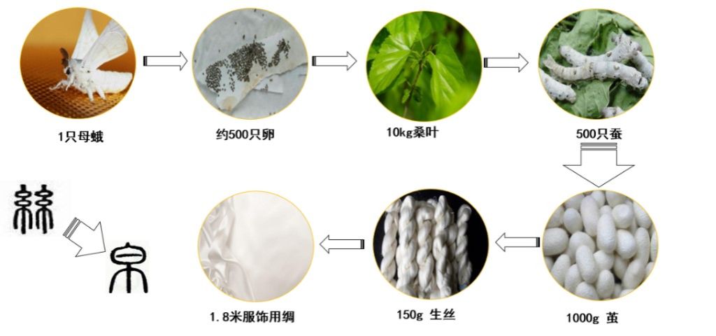 蚕丝是一种含氮高分子化合物的长丝纤维,主要成分是丝素蛋白、甘氨酸、丙氨酸和丝氨酸等成分。蚕吐丝时,实际上吐出了两根丝,凝固定形后合并成一根长纤维,正因如此,蚕丝的断面类似于眼镜。按照蚕的食性不同,蚕丝分为桑蚕丝、祚蚕丝、木薯蚕丝、蓖麻蚕丝等品种。蚕丝经过缫丝、织造和染整等工艺,就能成为人人皆知的丝绸,从蚕到丝,再到丝绸的过程如图1-3。