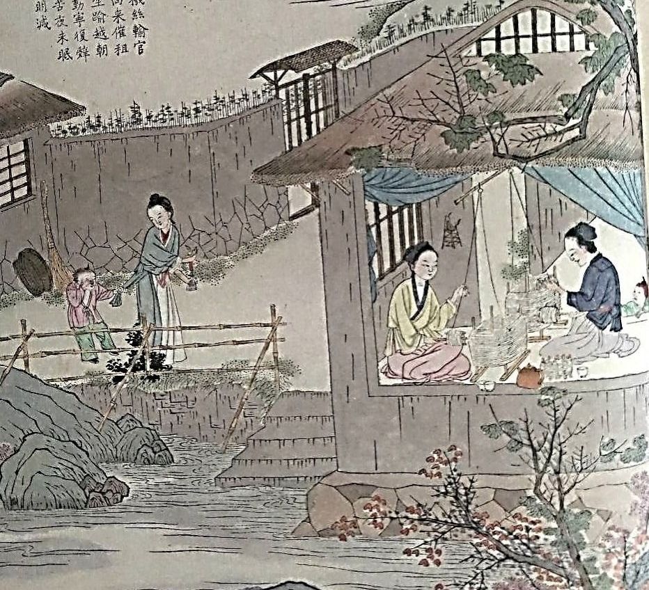 传说黄帝的元妃嫘祖在桑树下洗头,蚕茧从树上掉落在热水中,从此发现了缫丝,在嫘祖的倡导下,开始了种桑、养蚕、缫丝、织绸的历史。后人为纪念嫘祖衣被天下的功绩,尊称她为“先蚕娘娘”。图1-1,1-2为清代《耕织图》中描绘的古代养蚕和络丝情景。