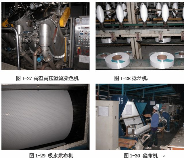 聚酯和锦纶等合成纤维长丝织造白织产品生产时,采用整经采用分批整经机(图1-19),无捻长丝织物,如纺类、绸类和缎类等织物需要经丝上浆(图1-21)以增加复丝中单丝间抱合力,上浆后需要并轴(图1-22),再分绞(图1-23)、穿经采用尼龙综丝(图1-24)穿经插筘后,后采用喷水织机织造(图1-25、图1-26)。染色一般采用高温高压溢流染色机(图1-27)。