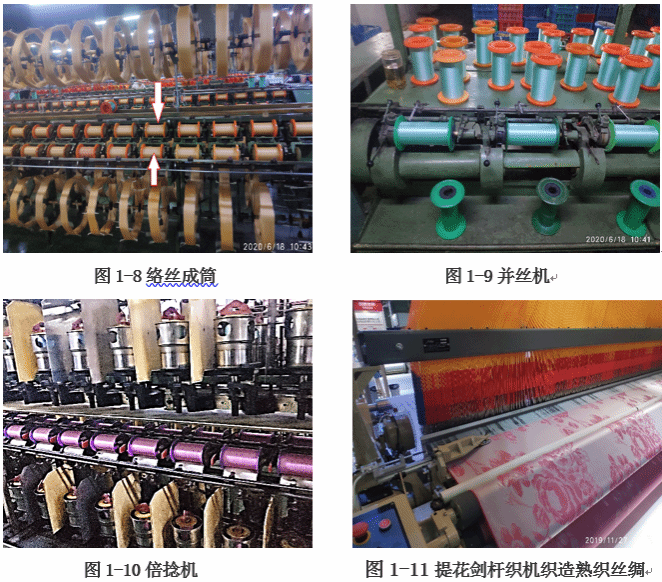 3.织造 为能改善产品性能,可以进行络丝(图1-8)、并丝(图1-9)和捻丝(图1-10),后道工序有整经、卷纬、穿经、插筘、织造等。经线和纬线,并按一定的组织规律相互交织形成丝织物,织机采用多色纬提花织物的剑杆织机生产(图1-11)
