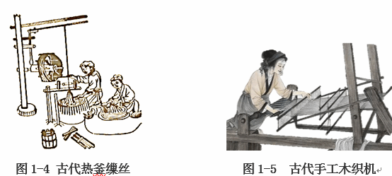 天然丝绸生产主要分为缫丝、织造和染整三个阶段,分为生织和熟织两种方式。已经由传统手工操作(图1-4、图1-5)转化为现代自动化、智能化生产。